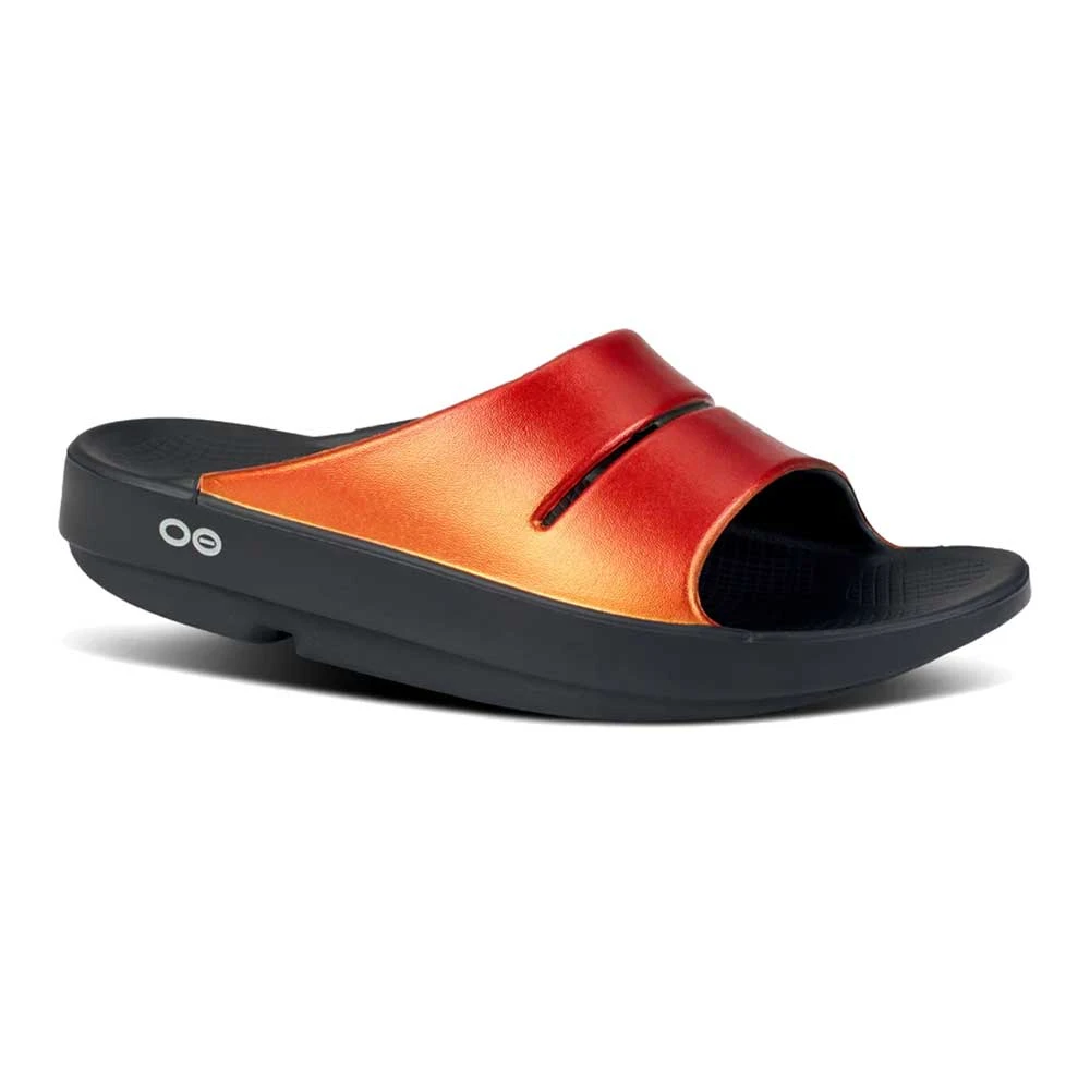 Luxe: Vibrant treatments and prints bring some extra fun and expression to OOFOS’ classic slide silhouette.